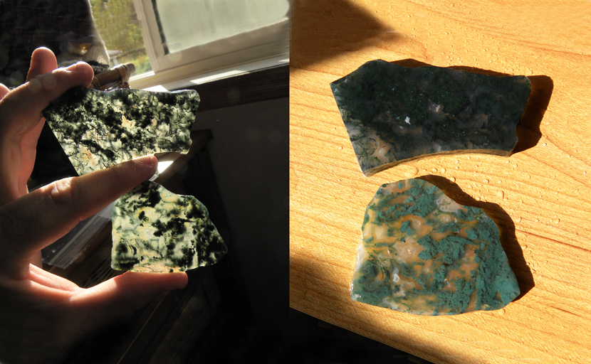 Webs of green moss suspended in clear and gold agate, two completely different color profiles in two slabs from India! One is a little more opaque than the other, but as you can see, that does not matter when the bright sun shines through them! If you love to walk beside the lake, or to bathe yourself in the wild ocean, this one is for you!