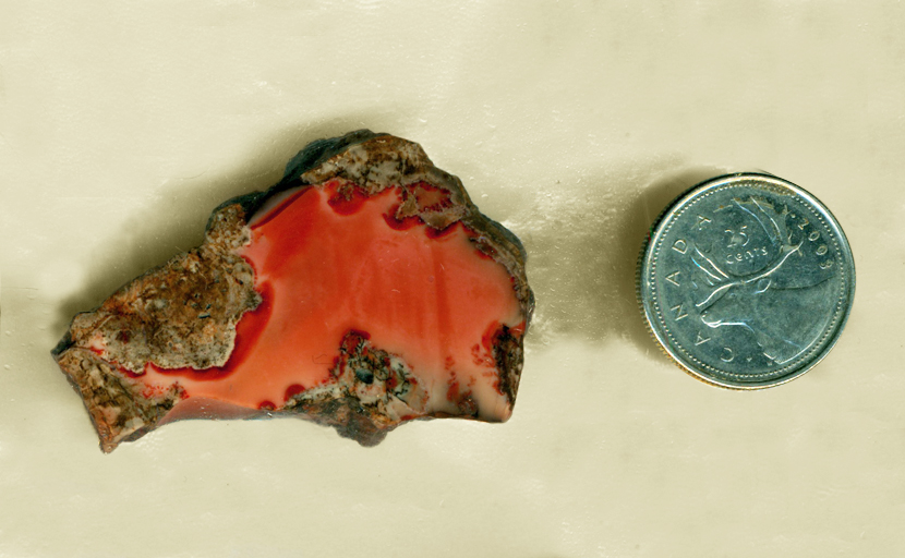 The hot pinkish-orange core of a sunrise, nesting in a series of dendritic matrix formations! Each of these is bordered by deeper, darker material, some of which extends into the stone in tree formations. This is an end-cut slab, providing more Morrisonite than an ordinary slab of this size would do, making the whole thing even more cool!